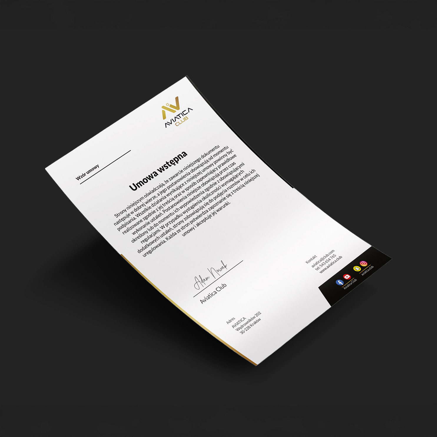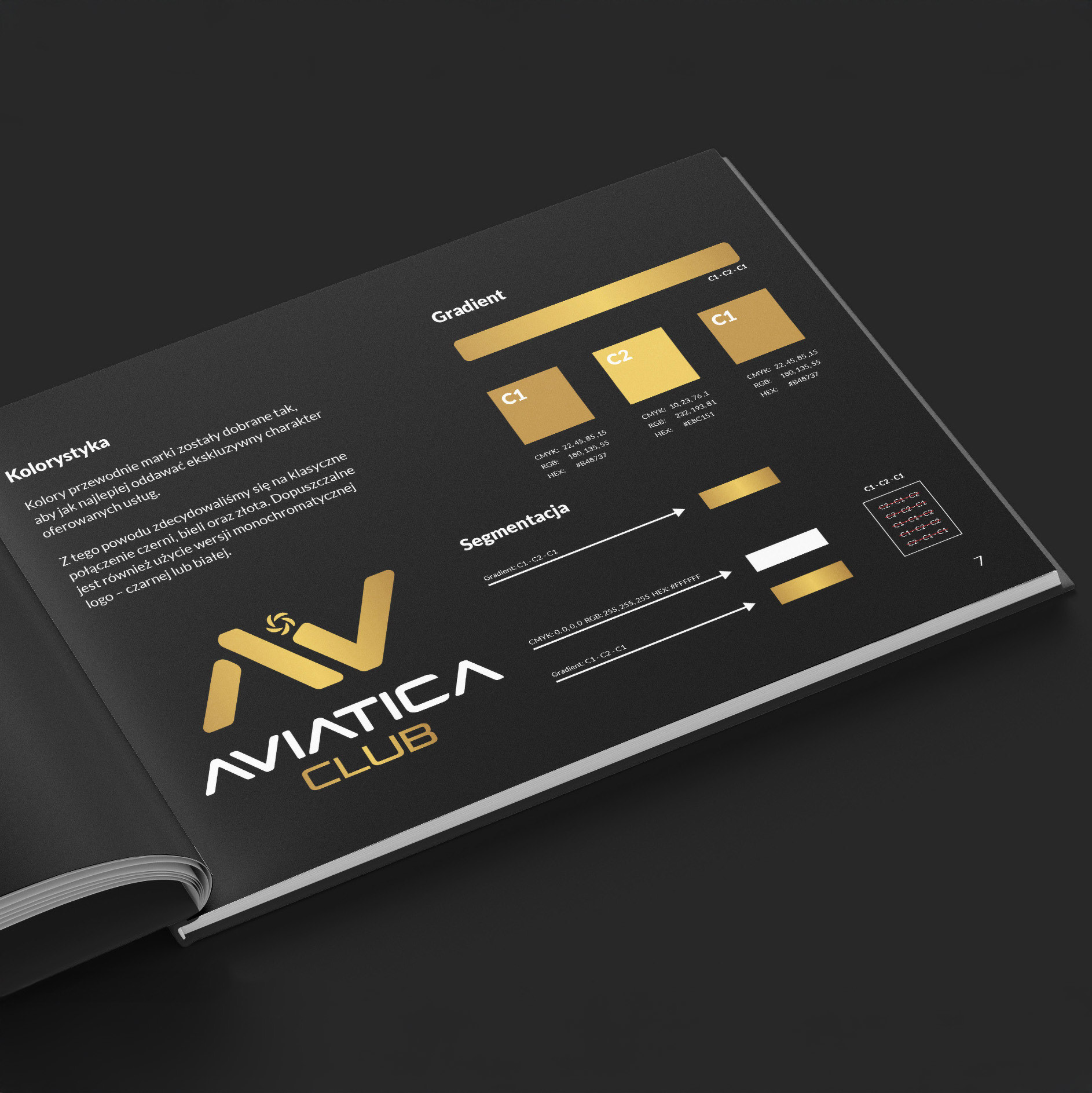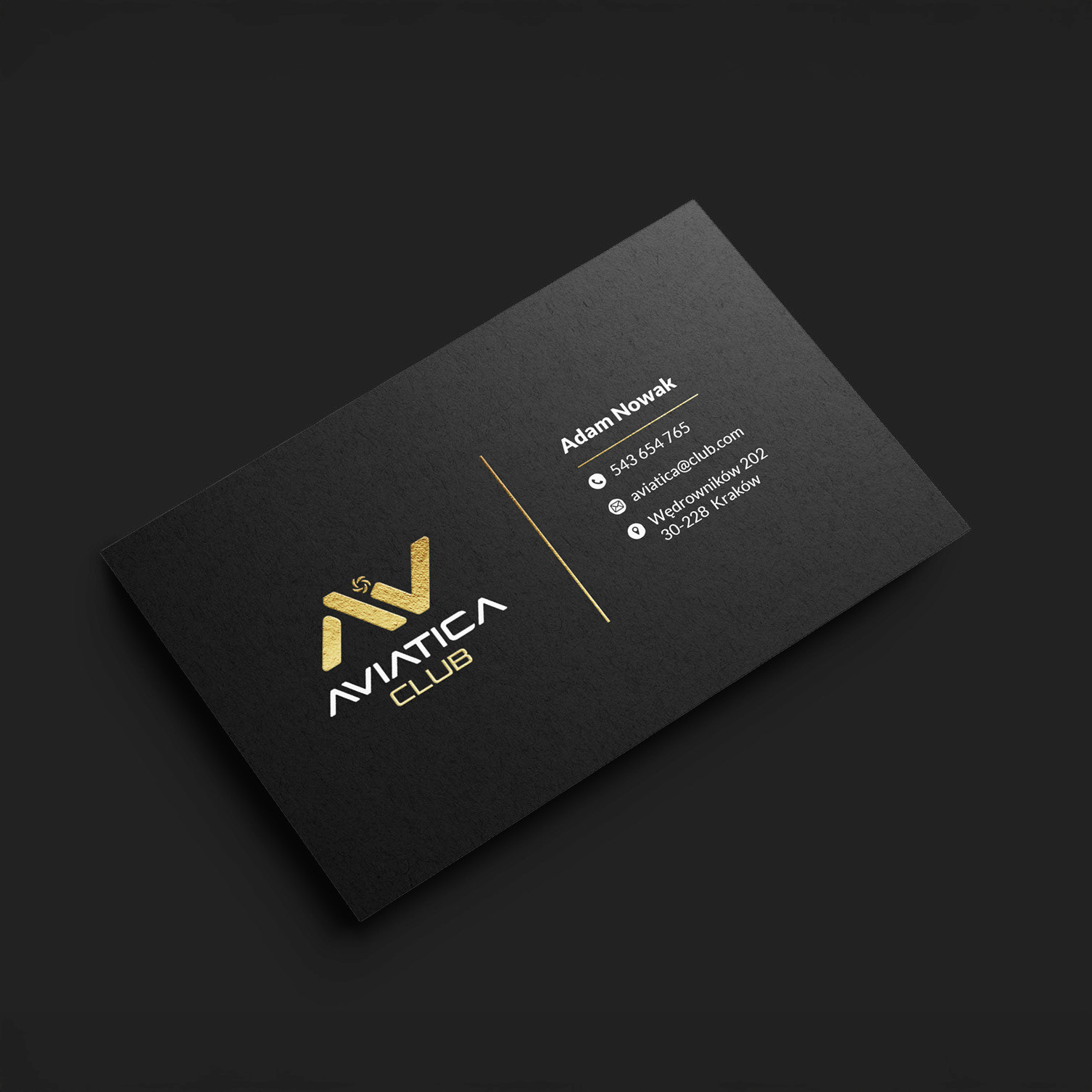 Aviatica Club to projekt prostej identyfikacji wizualnej firmy zajmującej się organizacją lotów widokowych. Klientowi zależało na ekskluzywnym charakterze marki, stąd klasyczne połączenie czerni, bieli i złota.