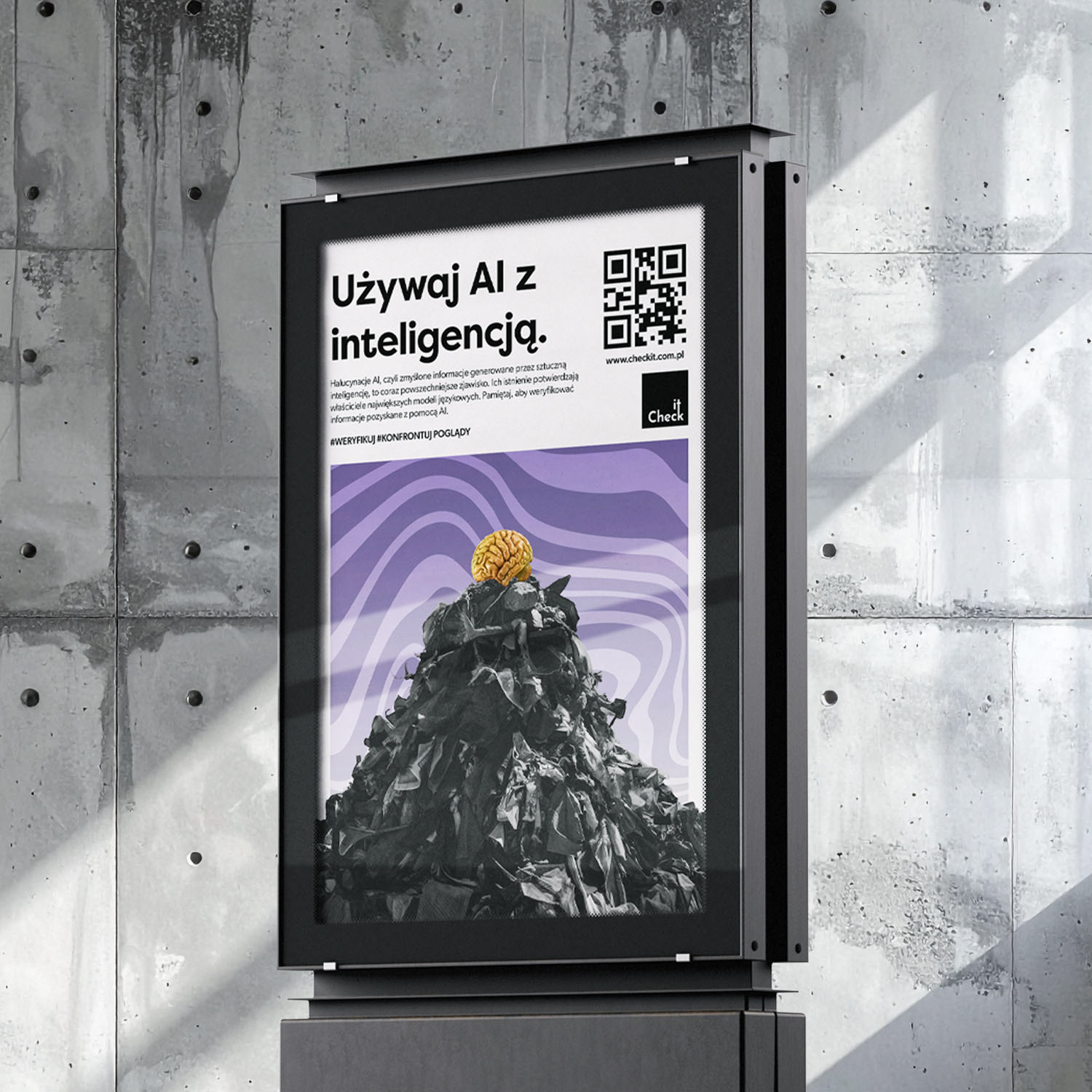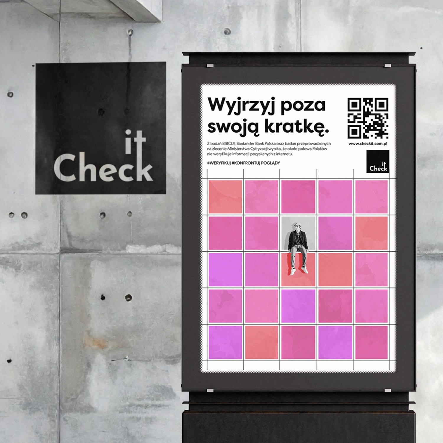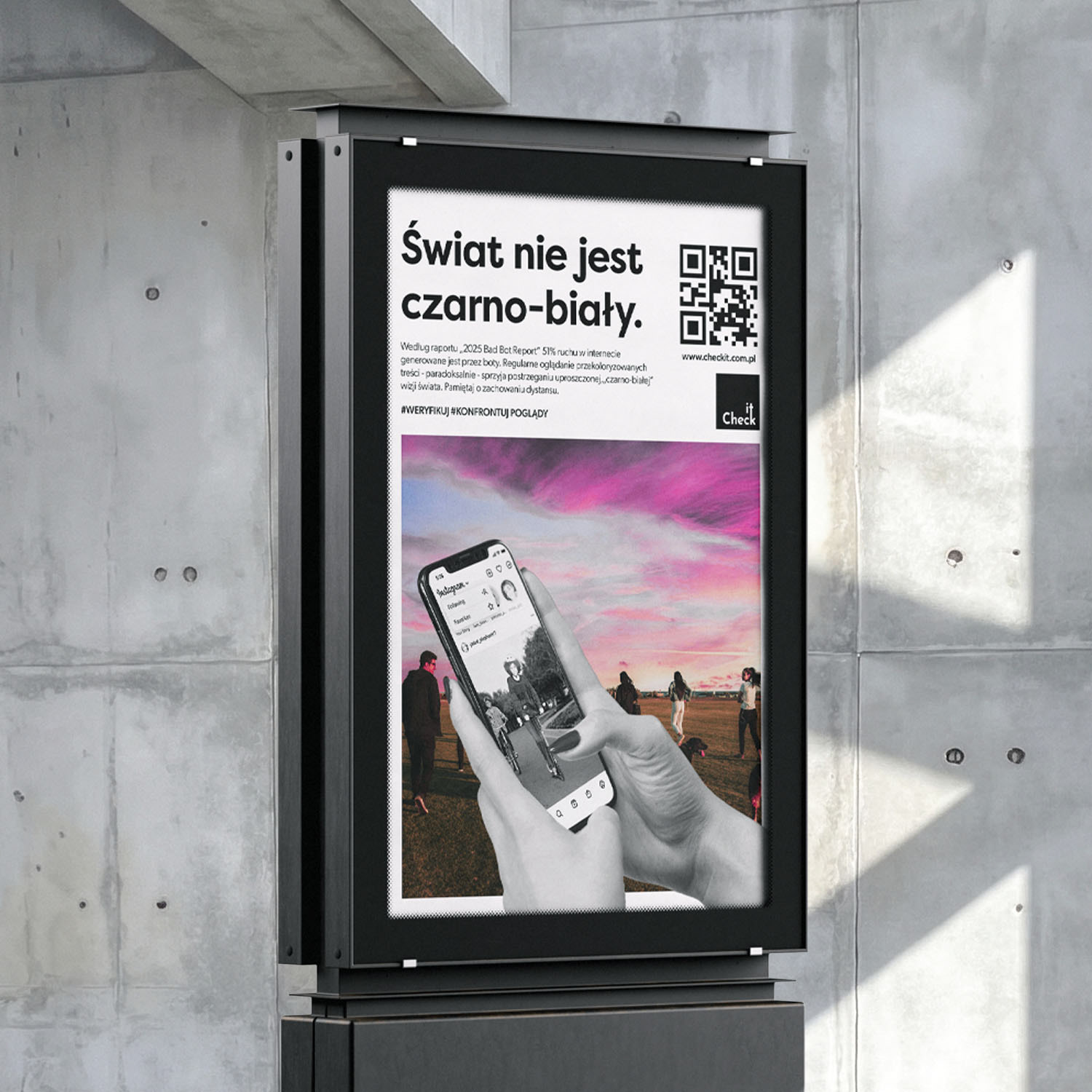 Check.it to projekt kampanii nastawiony na szerzenie idei krytycznego myślenia i weryfikowania informacji. W latach 20. XXI wieku ta umiejętność to jedna z kluczowych cech, która pozwala człowiekowi odróżnić prawdziwe informacje od fake newsów. Powszechna radykalizacja sprawia, że część ludzi chce widzieć świat jedynie w wysokim kontraście. Tworząc prototyp kampanii, chciałem pokazać, że życie ma dużo więcej odcieni.