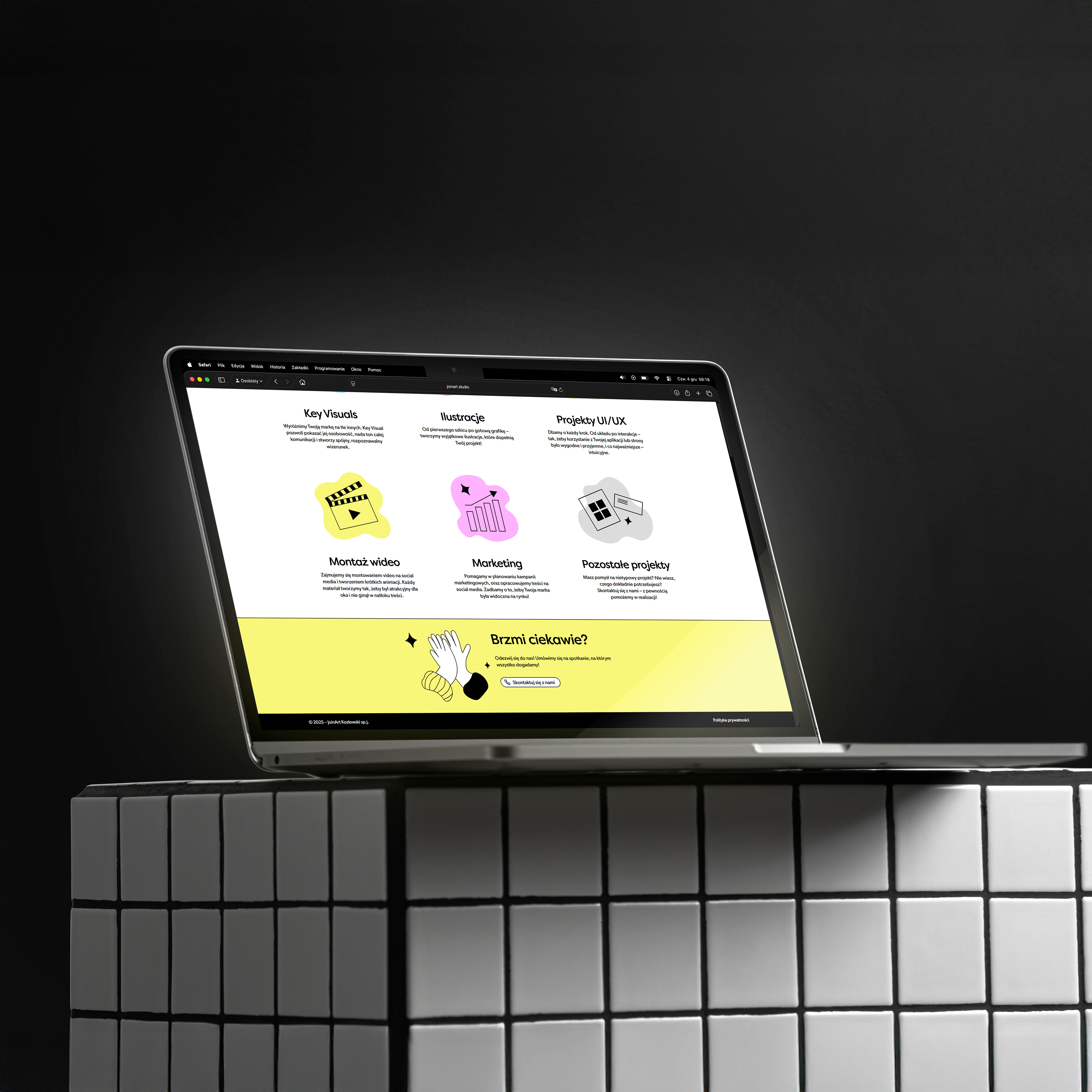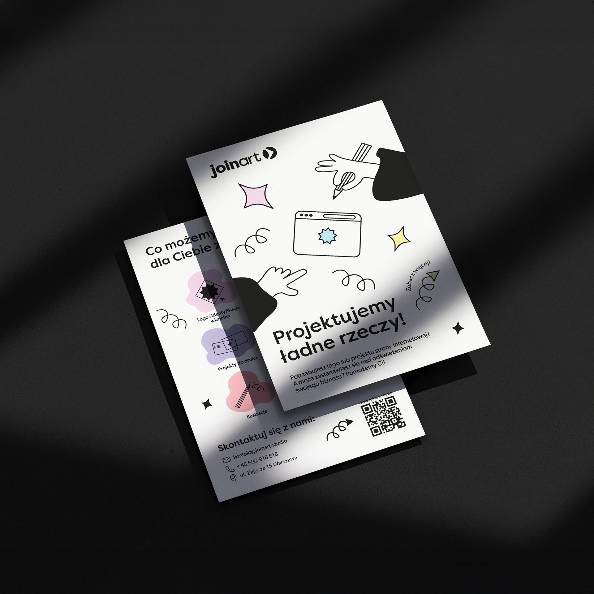 JoinArt to autorski projekt, który stworzyliśmy wraz ze znajomymi projektantami. Obejmował on zaprojektowanie oraz postawienie strony internetowej, stworzenie logo, materiałów promocyjnych, wizytówek i wielu innych rzeczy związanych z KV studia.