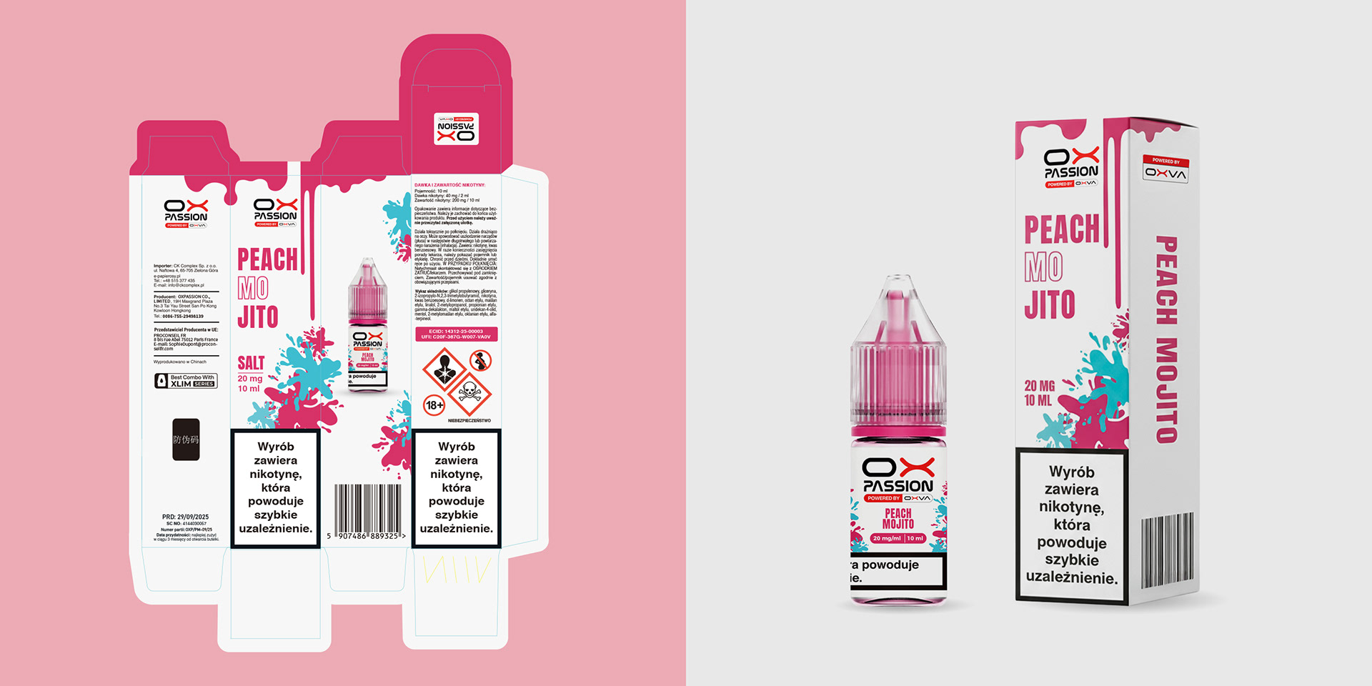 Projekt OX Passion to autorska koncepcja, która stawia na odważną ekspresję wizualną i świadome odejście od ciemnej stylistyki dominującej na rynku wyrobów nikotynowych. Zastosowanie czystej bieli jako bazy pozwoliło na wyeksponowanie dynamicznych motywów rozlanej farby, które nadają marce świeży, niemal street-artowy charakter.
