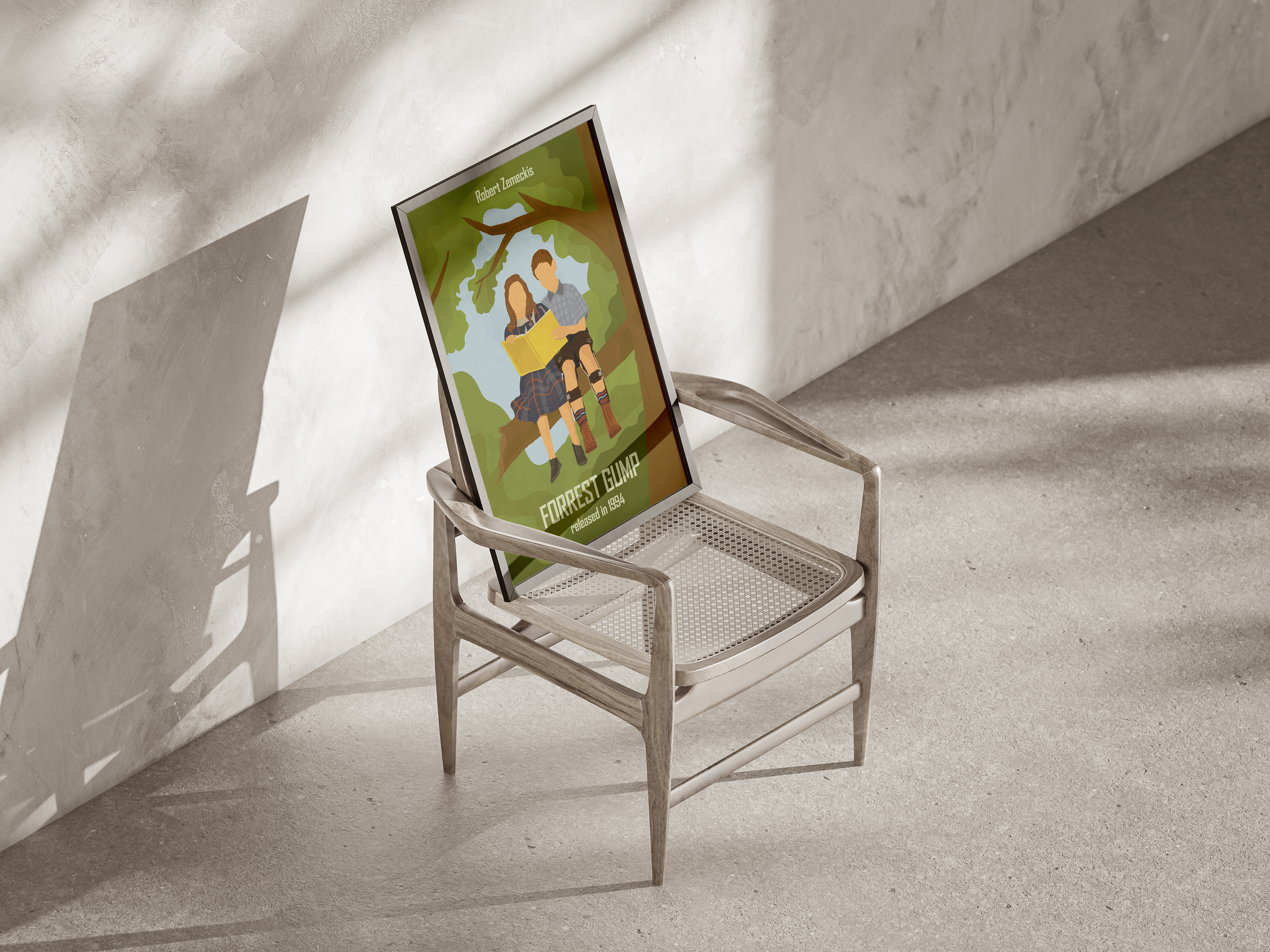 Plakat na bazie autorskiej ilustracji inspirowany sceną z filmu "Forrest Gump", wykonany w całości w programie Photoshop.