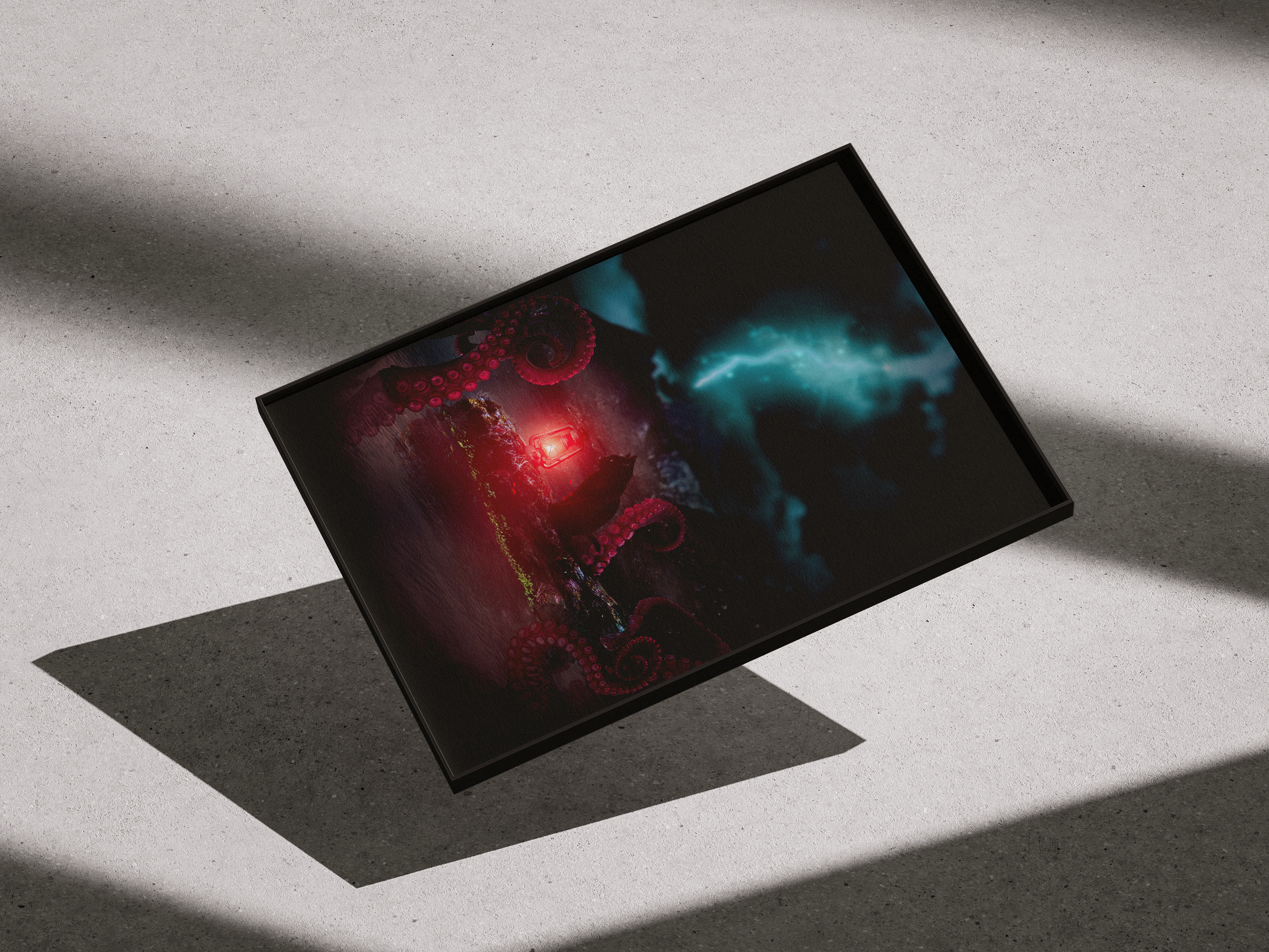 Projekt plakatu mieszający techniki cyfrowe fotomanipulacji z ilustrowanymi elementami, wykonany w całości w programie Photoshop.