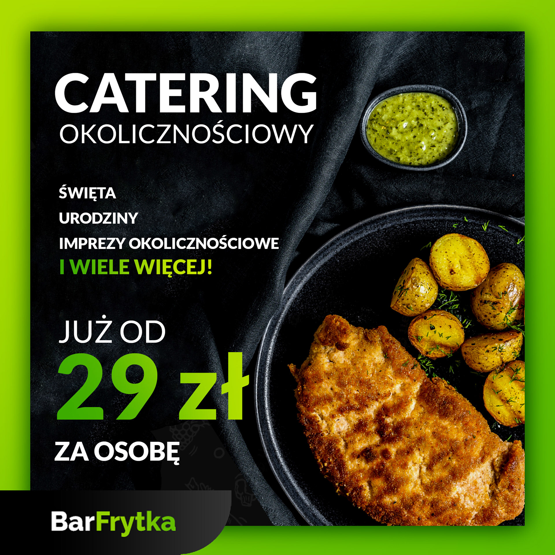 Kilka prostych grafik promocyjnych prezentujących ofertę cateringu Frytka.