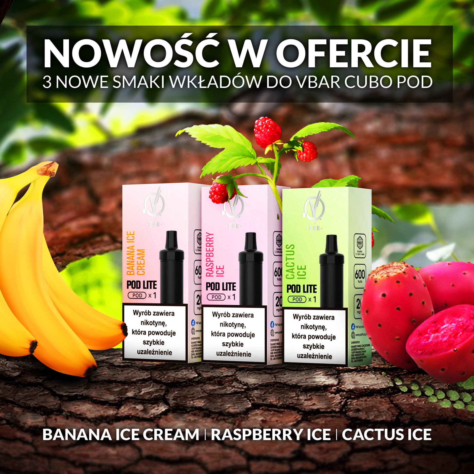 Przykłady grafik prezentujących różne warianty smakowe wkładów nikotynowych do urządzeń z serii Cubo Pod.